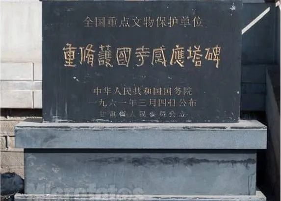 西夏碑,本名《涼州重修護國寺感通塔碑銘》,碑高26米,寬1米,厚03米。碑首呈半圓形,兩面正中用漢文和西夏文篆額,邊陰刻對稱的伎樂舞女,翩翩起舞,動作優(yōu)美,造型準(zhǔn)確;舞女胸和手腕上有飾物,赤露上身、雙腳,下著長裙,面形肌肉豐滿,吸收了敦煌飛天的藝術(shù)特點。碑身的兩邊呈殺角,邊上刻忍冬紋。碑一面為西夏文,共28行,滿行65字。西夏文是一種被人們遺忘了的語言文字,無法辨認,當(dāng)時被稱為“天書”。但碑的陽面為漢文,共26行,滿行76字。張澍先生見碑陽文末尾有“天祐民安五年歲次甲戌十五日戊建”落款,“天祐民安”為西夏年號,遂判定此碑為西夏碑文,因此,人們以后稱之為西夏碑。1961年就被國務(wù)院公布列為全國第一批重點文物保護單位。