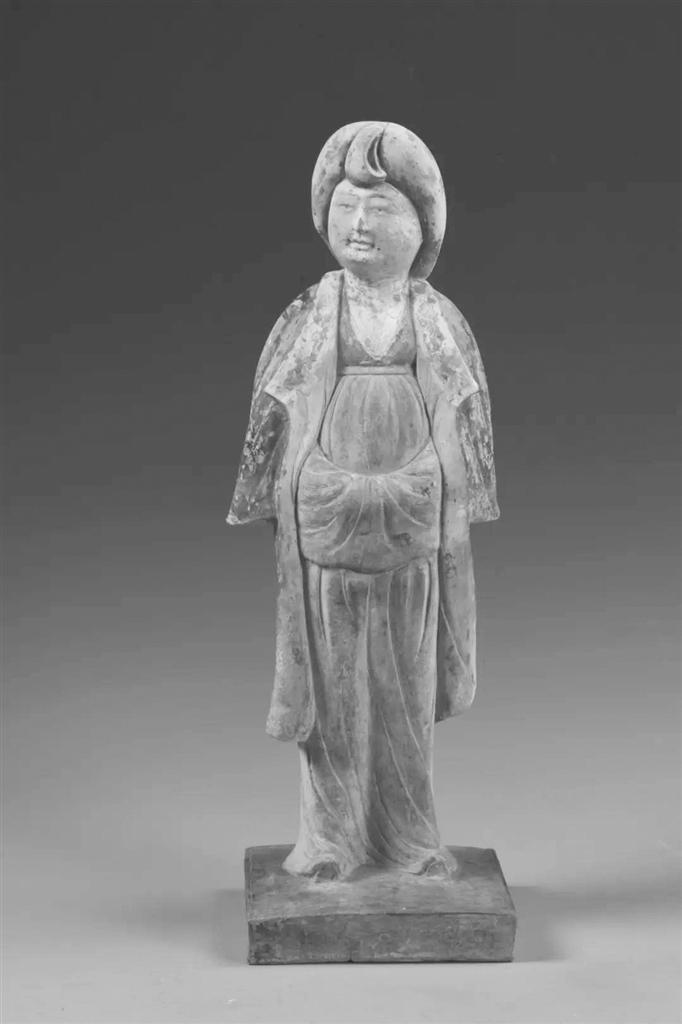 正大氣象,不僅在書法,也滲透到了民眾日常生活中。甘肅慶城博物館收藏有一件彩繪貴婦俑。這是唐開元十八年(730 年)的作品,雙手籠于胸前,站在方形臺(tái)座之上,一副唐代貴婦的裝扮。
