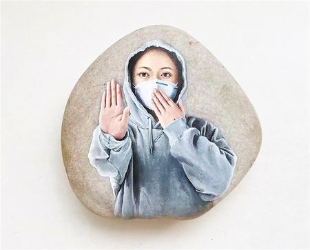現(xiàn)在,馬玉蘭已完全掌握了“石畫”的技巧,跟隨石頭的形狀走勢(shì)設(shè)計(jì)畫面,利用凸出的部分打造光澤感,落筆時(shí)精準(zhǔn)控制力度,她將疫情之下平凡人的神韻生動(dòng)地體現(xiàn)在每一次運(yùn)筆中。