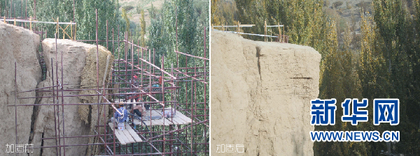 敦煌研究院古代壁畫與土遺址保護創(chuàng)新團隊承接的新疆交河故城崖體加固項目前后效果對比(資料圖)。敦煌研究院 供圖