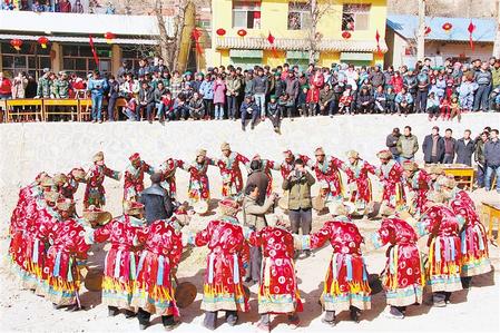 永靖王氏打鐵花、岷縣中寨鎮(zhèn)古莊村的巴當(dāng)舞、文縣鐵樓鄉(xiāng)白馬人的“池哥晝”……在眾多社火展演中,非遺文化遺產(chǎn)項(xiàng)目也在各地舉行。高高蹺、鐵芯子和永登太平鼓表演更是讓人們?cè)隗@險(xiǎn)、刺激的視覺(jué)沖擊中過(guò)足了癮。