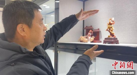 圖為玉雕手藝人李學(xué)平向記者展示自己用“巧雕”技藝雕刻的敦煌飛天系列作品。 高瑩 攝
