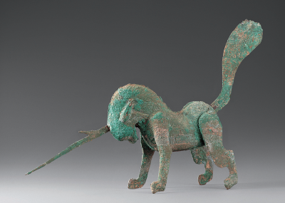 獸頭向前沖,角向前刺,扁尾上翹,四足跨張作角斗狀,全身鑄有獸毛的紋飾。角和尾可拆卸。獨角獸是傳說中的一種神獸,隨葬在墓中,起鎮(zhèn)墓辟邪的作用。