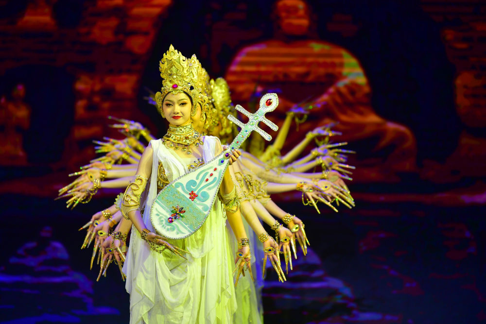 2021年9月24日,第五屆絲綢之路(敦煌)國際文化博覽會(huì)和第十屆敦煌行·絲綢之路國際旅游節(jié)在甘肅省敦煌市開幕。圖片為演員在開幕式上演出。新華社記者陳斌 攝