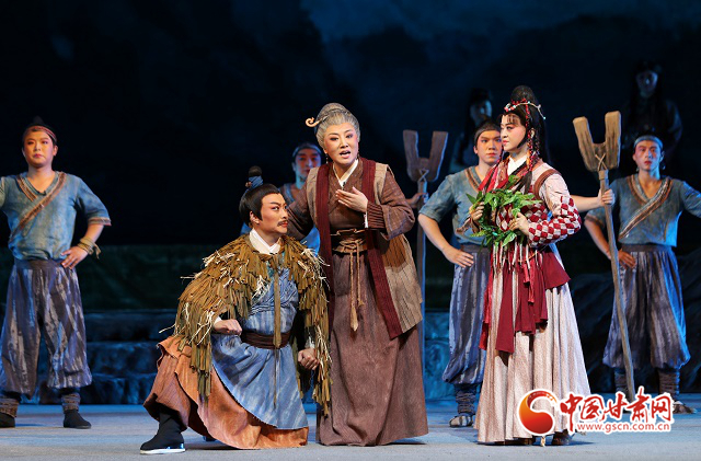 隴劇《大禹治水》是在甘肅省文化和旅游廳全程指導(dǎo)下,《黃河流域生態(tài)保護(hù)和高質(zhì)量發(fā)展規(guī)劃綱要》出臺(tái)之際,甘肅文藝工作者挖掘黃河文化蘊(yùn)含的時(shí)代價(jià)值,講好“黃河故事”,實(shí)施隴原文藝高峰攀登工程、加強(qiáng)非物質(zhì)文化遺產(chǎn)保護(hù)傳承的具體行動(dòng)。該劇將“大禹”這個(gè)上古英雄請(qǐng)下神壇,為他賦予了親情、愛(ài)情、家國(guó)情懷,在兩個(gè)小時(shí)的演出中,領(lǐng)銜出演“大禹”的優(yōu)秀青年演員邵炳德與雷通霞、竇鳳霞、佟紅梅等“三朵梅花”同臺(tái)飆戲,火花四濺的“開(kāi)山”、扣人心弦“治水”,將大禹和先民們不畏艱險(xiǎn)、篳路藍(lán)縷的開(kāi)拓精神和奮斗精神,演繹得淋漓盡致,深深震撼著現(xiàn)場(chǎng)觀(guān)眾。而隴劇音樂(lè)獨(dú)有的“麻簧”、以皮影戲?yàn)楸憩F(xiàn)手法的“月下婚禮”場(chǎng)景、水袖舞場(chǎng)景,把人物的情緒表現(xiàn)得栩栩如生,將獨(dú)具特色的隴劇藝術(shù)盡情綻放在舞臺(tái)之上。