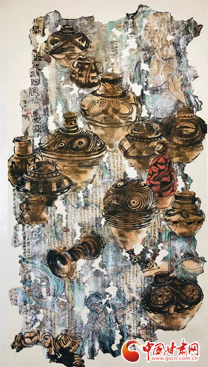他的這幅作品《絲路遺珍-馬家窯》于2018年獲甘肅美術專業(yè)最高獎“金駝獎”,采用黃河的“s”型構圖展開,將八千年前新石器時代大地灣文化、馬家窯文化的經典代表器物分次展開。作品左上角及中間部分依次疊加,穿插,繪制中與敦煌文化中的壁畫、飛天、佛像有機結合,寓示絲路文化有序傳承、源遠流長,又對畫面的視覺撥高提升。