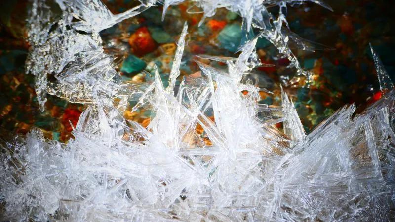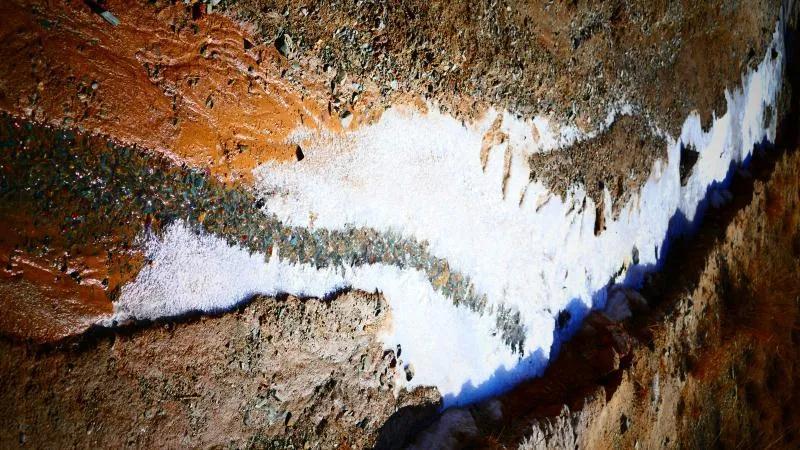 在丹霞山間可見(jiàn)一條冰凍似凍的水溪,系小泉河支流,在陽(yáng)光下透過(guò)像東北冬天窗花一樣的冰花,可看見(jiàn)水下的鵝卵彩石,望遠(yuǎn)看去小溪像一條披上雪衣的彩龍。