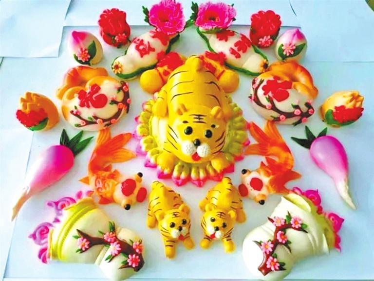 紅艷艷的牡丹花、形象各異的小動(dòng)物……王霞制作的花饃不再是普通的食材,而是栩栩如生的藝術(shù)品。放在展臺最中間的一個(gè)巨型花饃格外吸睛。這個(gè)花饃用一層層面餅做底座,每一層面餅上都有牡丹、月季、百合等各種花卉競相開放,不時(shí)有蝴蝶和小鳥停留在花朵上,充滿著喜意。
