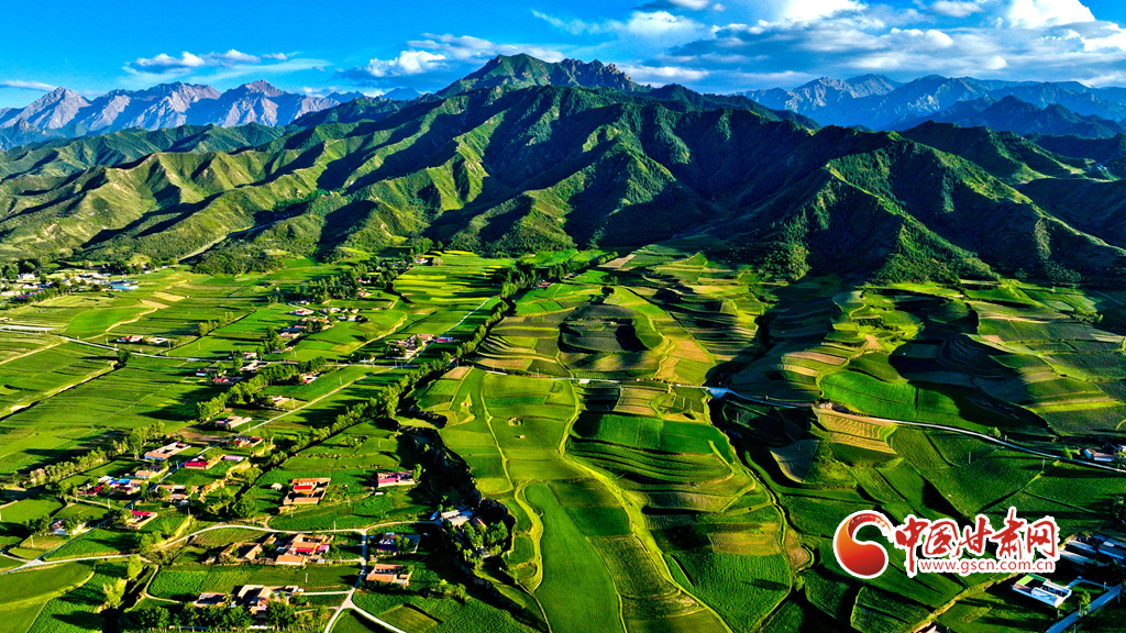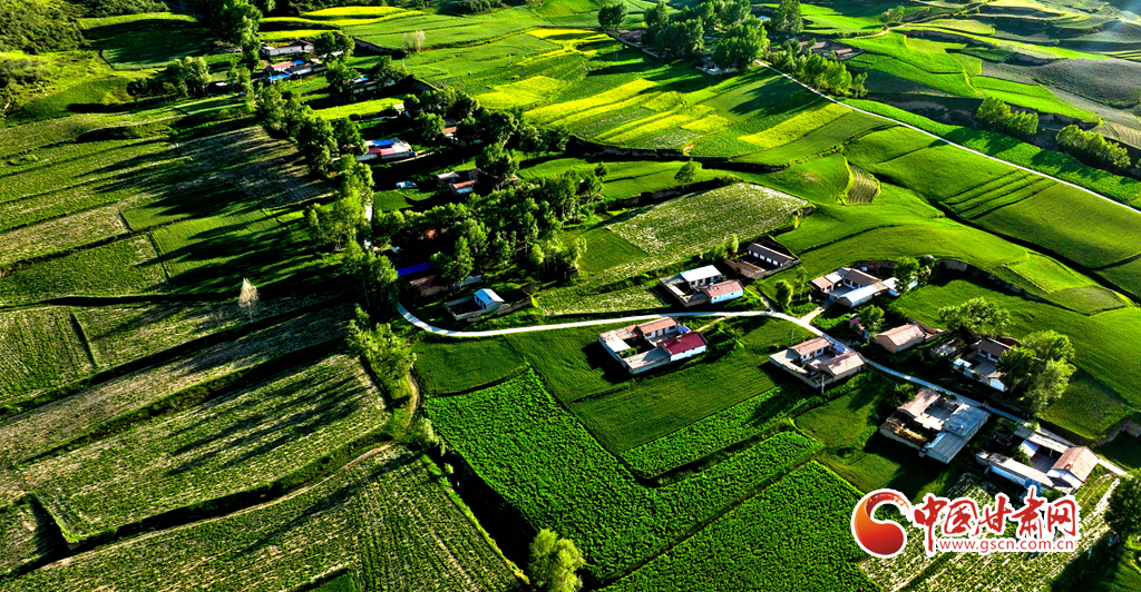 夕陽映襯下的祁連山北民樂縣豐樂鎮(zhèn)易家灣村,綠油油的莊稼生長旺盛,林木蓊郁層林盡翠,呈現(xiàn)出生機勃勃的景象,猶如“巨幅綠毯”。
