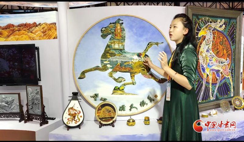 “‘黃河之濱也很美’作品采用掐絲琺瑯工藝,將銅奔馬與蘭州的獨特文化標志和美景美食如中山橋、黃河母親、牛肉面、太平鼓等進行融合,展現(xiàn)了蘭州這座城市的文化底蘊和人文情懷。”李婕正一遍遍為參觀者介紹著展品。