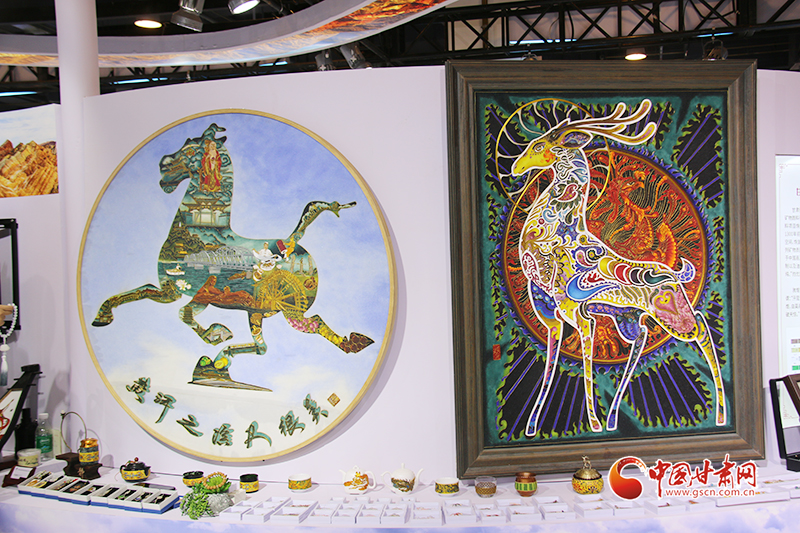 和阮琳的刻葫蘆一樣,由甘肅李明海琺瑯壁畫文化傳承發(fā)展有限公司展呈的“黃河之濱也很美”和靈動的九色鹿等充滿敦煌元素的掐絲琺瑯壁畫流光溢彩,精美絕倫,參觀問詢著絡繹不絕。