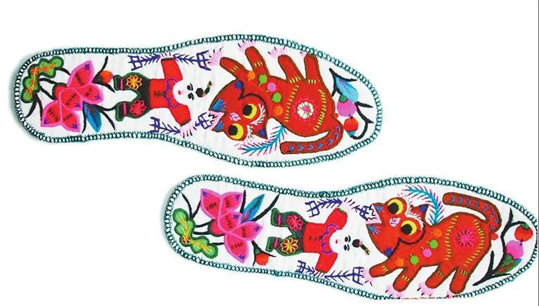北方黃土高原,陜甘寧晉一帶,采用這種藝術(shù)縫制刺繡的衣物飾品有拼布藝術(shù)的鮮明特征,具有浮雕效果。其具體做法是將貼填繡畫相結(jié)合,有人叫做拼貼浮雕繡,在肚兜、枕頂?shù)鹊闹谱髦羞@種技藝采用最多。因?yàn)槎嗍钦w設(shè)計(jì),分部件制作,然后組合成一個(gè)完整的畫面在布上,所以叫“逗”,“逗”是秦隴方言,就是手指把不同部件小心拼合在一起組成圖案的動(dòng)作,因?yàn)椴计?,要小心仔?xì),輕輕拼合,所以會(huì)“逗裹兜”“逗夾襖”的媳婦,就是心靈手巧的人,說(shuō)一個(gè)女性會(huì)“逗”,就是對(duì)她的女紅技藝的認(rèn)可。