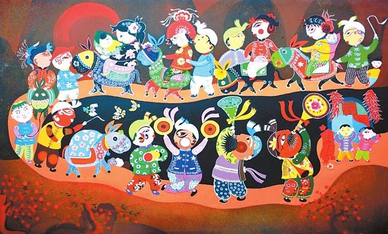 華池民間布貼畫是一種古老的民間工藝美術(shù),是隴東文化的重要組成部分。華池拼布創(chuàng)作以粗布為原料,色彩豐富鮮艷,剪貼的邊線明朗整潔,富有木刻版畫的刀木特點(diǎn)。其內(nèi)容多取材于人物、動(dòng)物、花鳥等題材,注重色彩對(duì)比,以大紅大紫的色彩,夸張化的描述,追求強(qiáng)烈的直觀效果,講究裝飾性;風(fēng)格浪漫稚拙,渾厚質(zhì)樸,氣韻生動(dòng)。