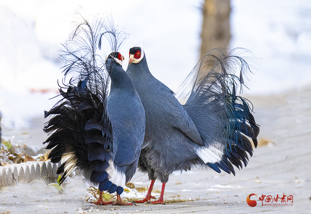 近日,祁連山國家公園甘肅省管理局張掖分局工作人員拍攝到國家二級保護野生動物藍馬雞覓食嬉戲場景。