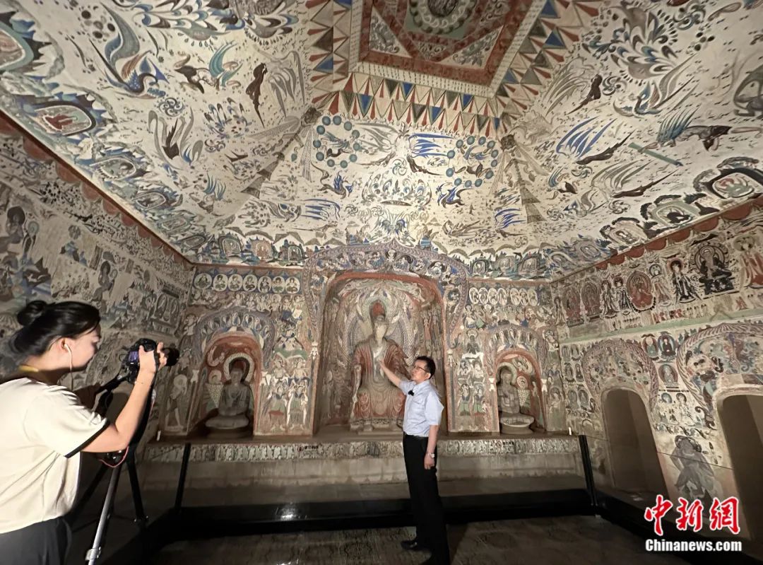 2023年7月,敦煌研究院副院長張?jiān)衷诙鼗湍呖叩?85窟原大復(fù)制窟內(nèi),接受中新社“東西問”獨(dú)家專訪。丁思 攝