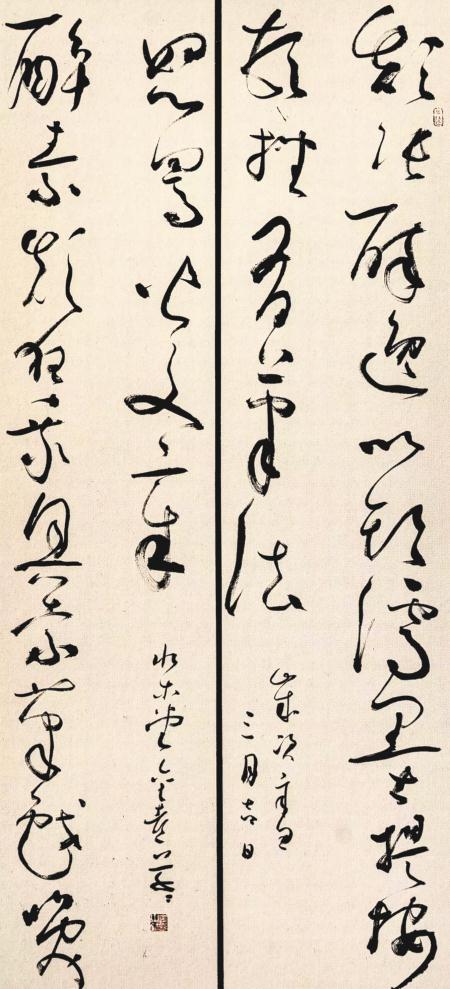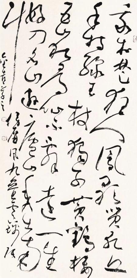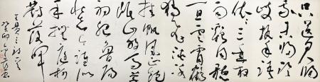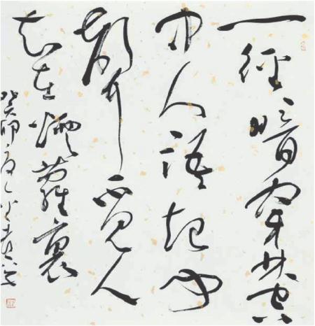 走出去,站在全國的高度,集中進行學(xué)習(xí)和交流,對一個立志進取的書法家,可以說是一個脫胎換骨的修煉,中國書法發(fā)展的當(dāng)代狀態(tài),成為進取的最大參照,風(fēng)格極力貼近時代風(fēng)尚,在此基礎(chǔ)之上加入個人的鮮活語素,在作品中即表現(xiàn)出了時尚,又有自己的構(gòu)想,才有自己的一席之地。侯金喜抓住時代脈搏,積極捕捉在展覽中尚處于不顯眼的元素,不斷加以顯化,使個人的作品在龐大的展出體系中獨具風(fēng)采,難度可想而知,在高手如林的態(tài)勢下,侯金喜知難而上、刻苦磨煉,向經(jīng)典取法,向當(dāng)代名家問路,雙向融合、求新求變,經(jīng)過了這樣一個長的時段的求索,他的草書在全國眾多的草書家中拔地而起,引發(fā)了廣泛的關(guān)注??此牟輹?,變化的度把握在了一個比較妥帖的度上,他不以奇異詭變?yōu)槌缟?,筆畫塑造大體以傳統(tǒng)語言為宗,使柔和與剛健統(tǒng)馭在一起,這種立意基本圍繞中國書法流變的中軸線,可以受到時間的考驗,在一些筆畫中注入的時代信息,經(jīng)過個人的藝術(shù)提煉,具有了新的生氣。在結(jié)構(gòu)選擇上,他同樣進行了深思熟慮,反復(fù)篩汰了過度追求時髦的招數(shù),一直強調(diào)深層次的內(nèi)涵,把一個結(jié)體放在歷史的縱向上反復(fù)琢磨,他自己認為,形象造型只有沿著時序的推進,才能有機地融入歷史,成為藝術(shù)的終極選擇,所以侯金喜的探索是審慎的,邁進是疊復(fù)的,我們欣賞他的作品,可以看出他思考的勤謹,每一個階段都有不同的表達,欣賞者隨著他的筆觸的流瀉,可以領(lǐng)略到豐富的視覺享受。