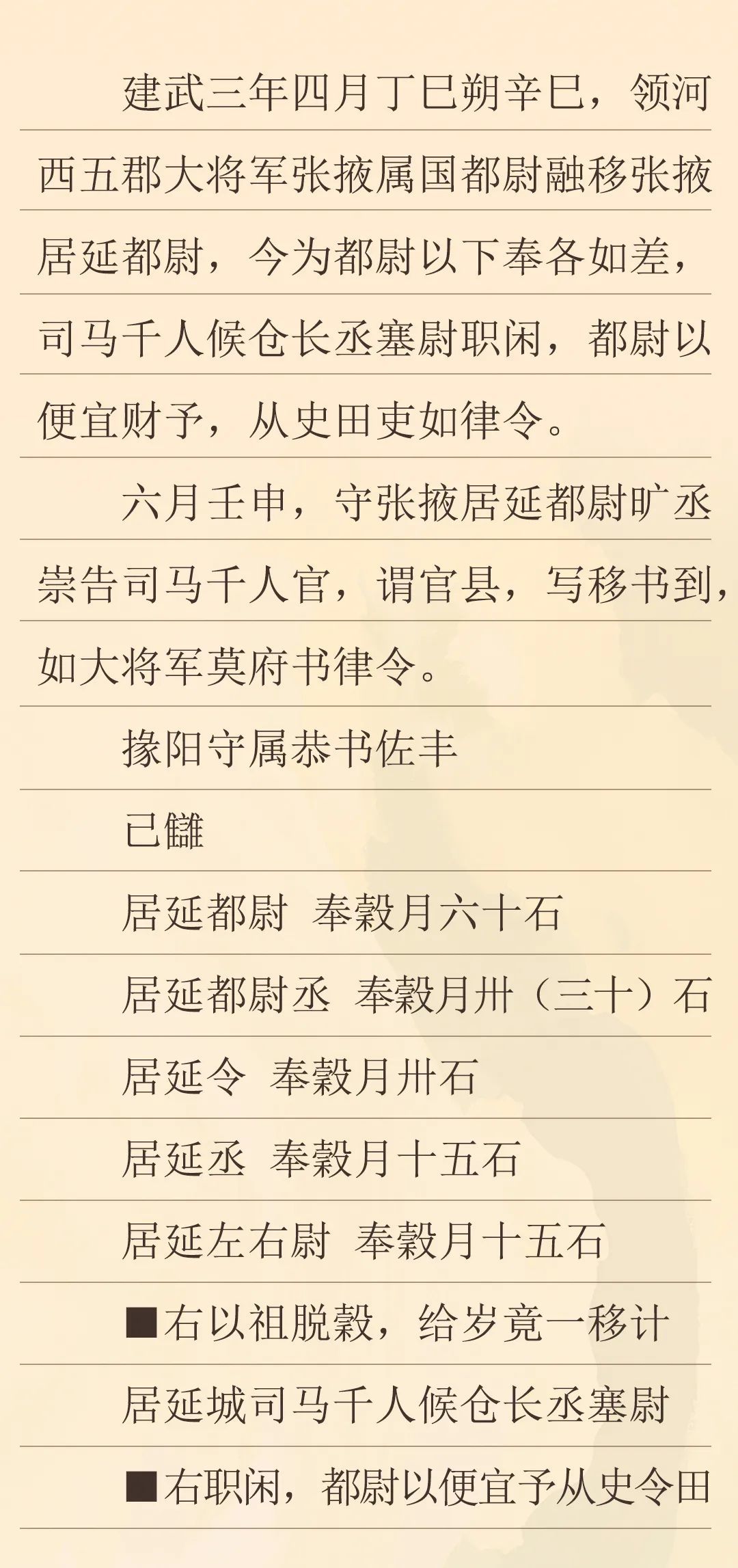 這封冊(cè)書(shū)記載了建武三年,竇融管轄河西時(shí)發(fā)布的一條關(guān)于都尉以下官吏奉谷等差的命令。根據(jù)竇融發(fā)布的新規(guī)定,我們可以看到,秩比二千石的居延都尉月奉谷僅為六十石,史書(shū)有“十斗一斛”及“十斗一石”的記載,此六十石即是六十斛,相比于史書(shū)記載中比二千石每月百斛的俸例要少,而其余官吏的俸祿也相應(yīng)要少,雖然漢代不同時(shí)期的官吏俸祿存在變化,但對(duì)比所見(jiàn)的這種情況,可能也跟兩漢之交戰(zhàn)亂頻仍的社會(huì)環(huán)境有重要關(guān)系。