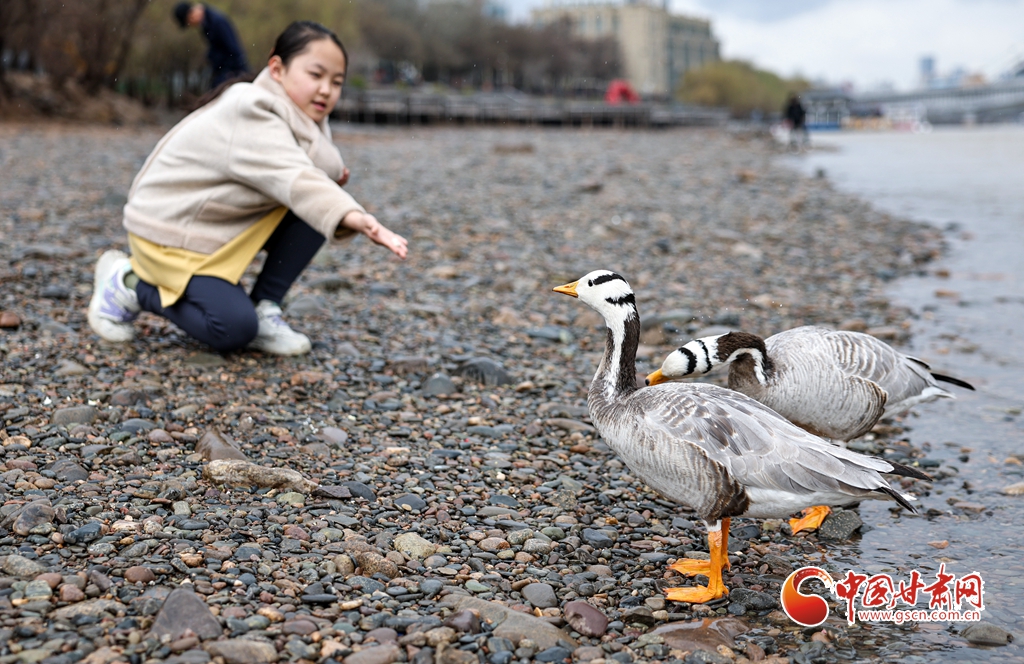 當日,在蘭州市城關(guān)區(qū)黃河河畔,一對斑頭雁與市民溫馨相遇,吸引不少市民駐足投喂,拍照“打卡”。