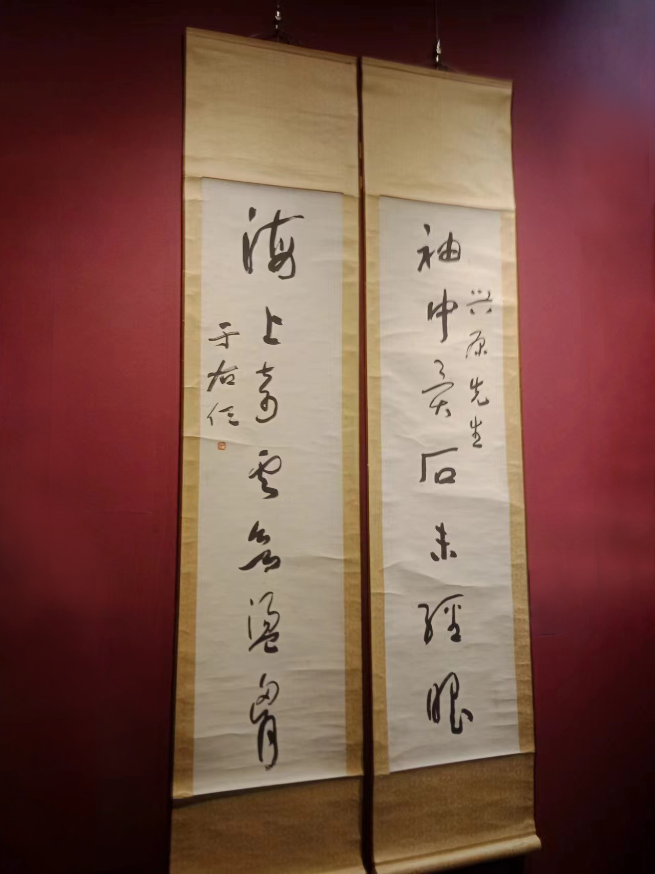 這次展出的于右任先生書法十余幅,有草書、行書和楷書。草書古詩“蜀本九經(jīng)最先出,后來孳乳到長興。蒲津毋氏家錢造,海內(nèi)通行價(jià)倍增(此幅落款‘五十一年’,應(yīng)是1962年先生去世前的作品)”,行書七言聯(lián)“袖中異石未經(jīng)眼,海上奇云未蕩胸”,楷書七言聯(lián)“萬卷藏書宜子弟,十年種木長風(fēng)煙”等,書藝嫻熟,各有特色。所展墨寶筆法老練,墨氣逼人,筆者懷著崇敬的心情駐足敬賞,猶如與先生會(huì)面,久久不忍離去。