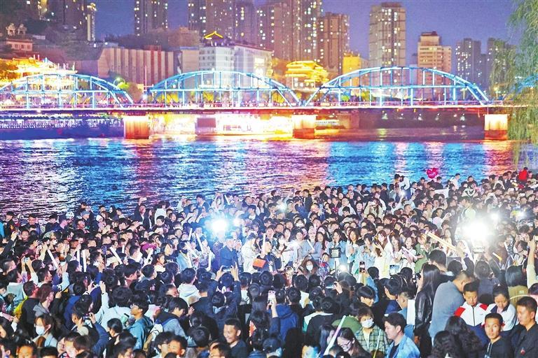 作為蘭州的地標之一,中山橋已經(jīng)是來蘭游客必“打卡”的景點?;馃?ldquo;出圈”的“黃河大合唱”成為蘭州旅游新體驗。華燈初上,游客和市民齊聚黃河岸邊,隨著音樂齊聲合唱,場面壯觀,氣氛熱烈。“五一”假期首日,蘭州文旅市場迎來火爆“開門紅”,接待游客達到了86.42萬人次。