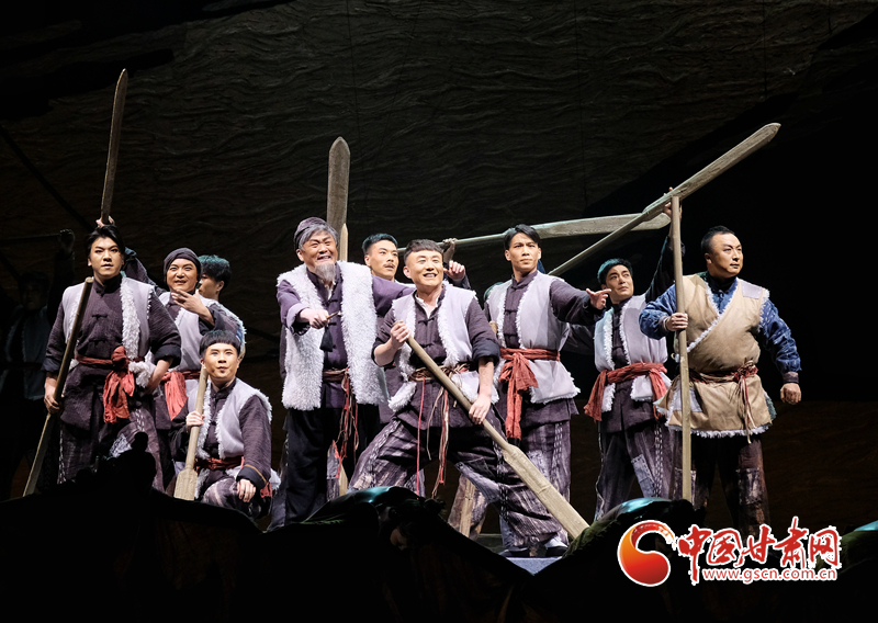 首演當晚,一曲黃河特色的“花兒”開場,將觀眾帶回到20世紀30年代末蘭州筏客子在黃河激流中勇敢拼搏的時代。劇中,筏客子們在經(jīng)歷了碼頭爭奪、蘭州遭受日軍轟炸、金城壯烈犧牲等重重考驗后,在國家危難時刻,舍棄個人恩怨,團結起來支援抗戰(zhàn),組成水上大型運輸隊,將大量物資安全送達抗戰(zhàn)前線。