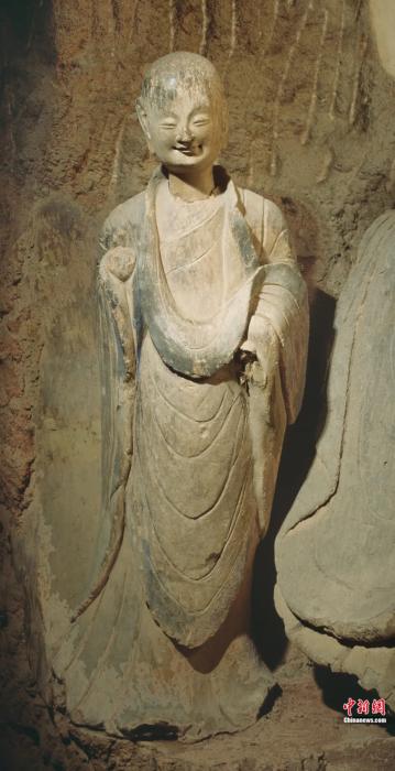從石窟塑像的服裝來(lái)看,北魏早期佛像的半偏袒袈裟,是在原有偏袒袈裟基礎(chǔ)上,添加了右肩搭一角的袈裟,既體現(xiàn)了印度佛教傳統(tǒng),也增添了中原傳統(tǒng)服飾元素。隨著佛教中國(guó)化逐步推進(jìn),“褒衣博帶”成為典型裝束,造像面容也有了秀骨清像的中原風(fēng)格。