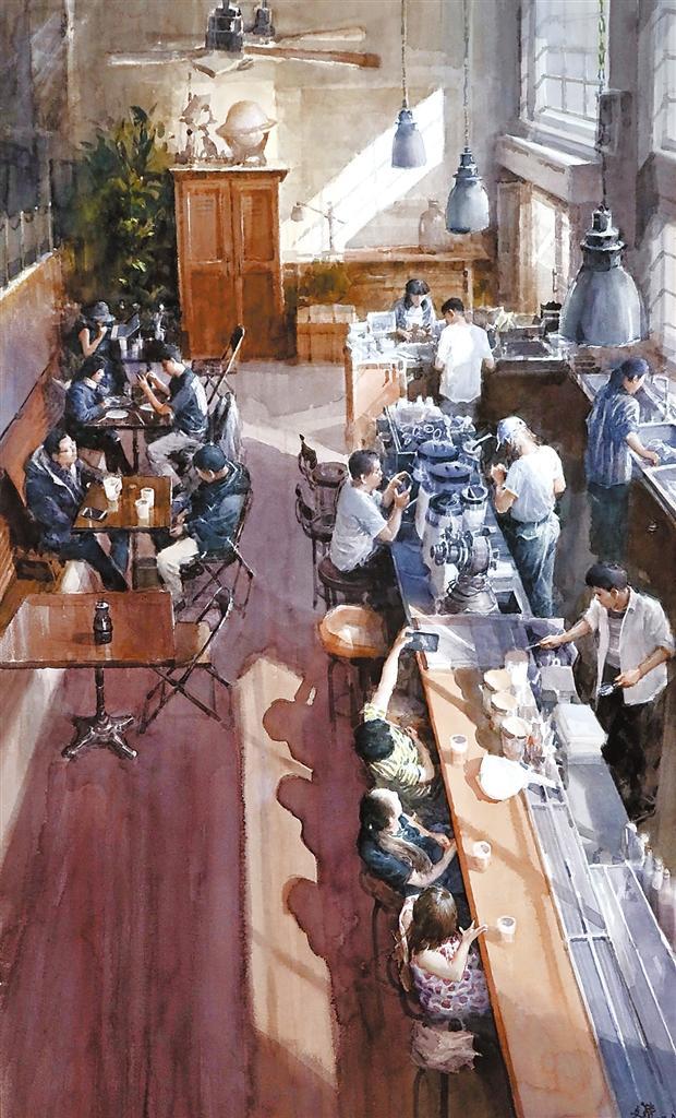 《網(wǎng)紅咖啡館的午后》用寫實(shí)方法展現(xiàn)了一個(gè)溫馨的生活場景。在構(gòu)圖上,以俯視的角度用大場景來做整體畫面的籌劃,在整體色調(diào)上以沉穩(wěn)厚重的暖色作為基調(diào),把光線穿插、引入到畫面中。在布局上,以陽光照耀下的咖啡館吧臺為主要表現(xiàn)組群,分別刻畫、塑造了工作中的前臺人員、打卡拍照的女性顧客群;把暗部區(qū)域,幾組在咖啡桌邊交談、用餐、喝咖啡的顧客群作為第二層次,展現(xiàn)他們不同的神情和體態(tài);然后完善整體的空間感。在用筆上盡量以松動的筆觸,又能展現(xiàn)細(xì)節(jié)的方式來塑造,利用水彩畫需要干、濕、松、緊相結(jié)合,多層次、多遍數(shù)進(jìn)行渲染的特性,盡可能達(dá)到預(yù)期效果。 (本版文圖由甘肅省美術(shù)家協(xié)會提供)