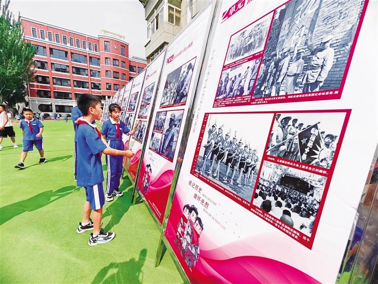 活動(dòng)現(xiàn)場(chǎng),該館講解員給孩子們講述了《抗戰(zhàn)烽火中的少年兒童》及《英雄血灑黃河畔——叢德滋》紅色故事。之后,蘭州市口琴藝術(shù)交流學(xué)會(huì)的成員現(xiàn)場(chǎng)演奏了《沒(méi)有共產(chǎn)黨就沒(méi)有新中國(guó)》《游擊隊(duì)之歌》《中國(guó)少年先鋒隊(duì)隊(duì)歌》等經(jīng)典紅色曲目。圖為學(xué)生觀看展板。