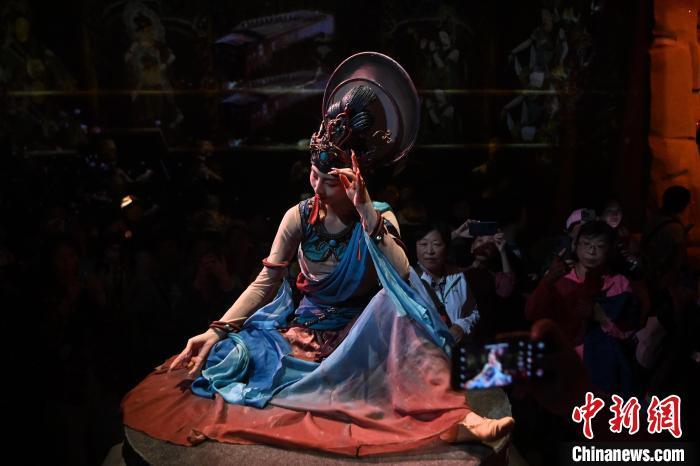 圖為演員在大型洞窟式沉浸體驗(yàn)劇《樂(lè)動(dòng)敦煌》中表演。九美旦增 攝