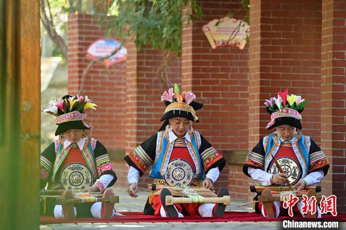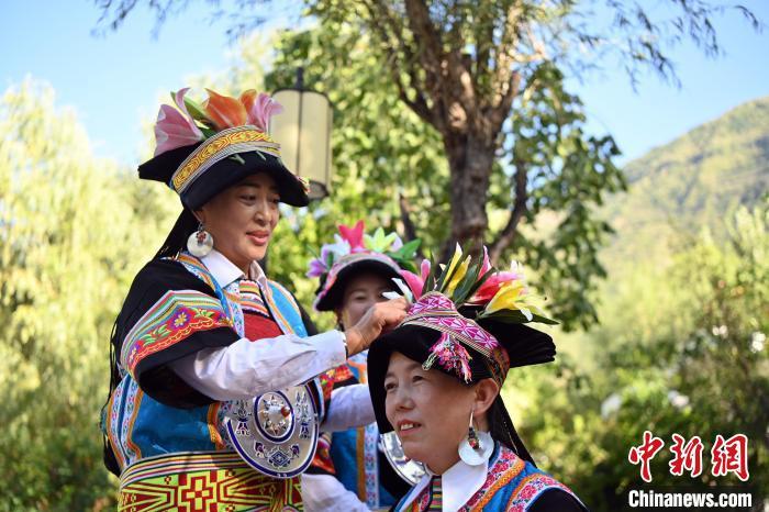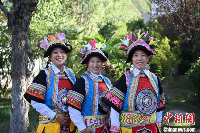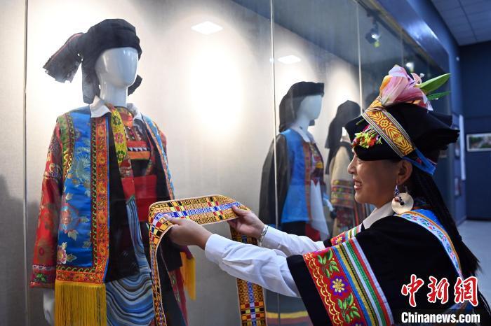 9月26日,甘肅省甘南藏族自治州舟曲縣,當?shù)夭刈鍕D女展示錦帶佩戴方式。錦帶是舟曲藏族婦女用以束腰、扎靴、攏發(fā)乃至點綴服飾的花帶子,艷麗多彩、圖案優(yōu)美。每逢吉慶節(jié)日,藏族婦女穿戴的華麗盛裝就需要少則五、六條,多則十幾條寬窄長短相宜的錦帶來裝飾。據(jù)介紹,藏族織錦帶技藝歷史悠久,一千多年以前,古羌族和吐蕃已有了較發(fā)達的手工編織技術,在艱難的生活條件下對服飾等生活用品除實用功能之外,已經(jīng)有了強烈的審美追求,是研究舟曲羌藏文化的“活化石”。中新社記者 九美旦增 攝