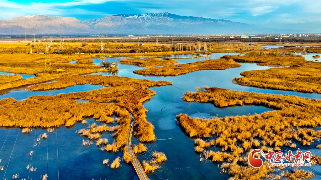 12月1日,俯瞰甘肅張掖國家濕地公園,夕陽余暉映照,金色茂密的蘆葦隨風(fēng)搖曳,蘆花翩翩起舞,碧波蕩漾的水面逐漸凝結(jié)成冰,整個濕地化作一片金色的童話仙境,令人陶醉于無盡的遐想之中。