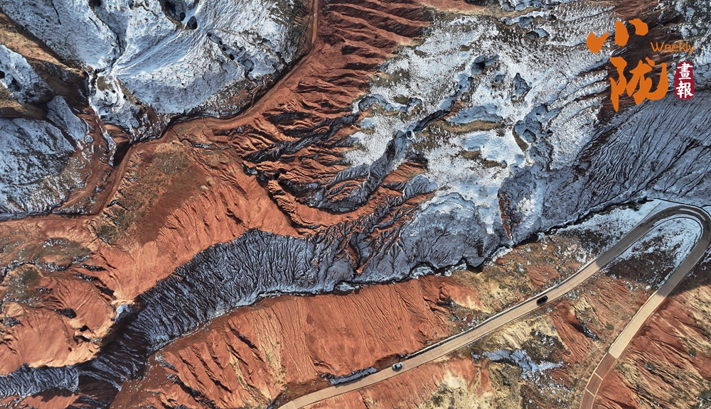 冬雪覆蓋在色彩斑斕的丹霞地貌之上,從高空俯視,層理交錯,色彩鮮艷,似一幅油畫。