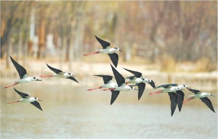4月9日,一群黑翅長(zhǎng)腳鷸在定西湖水面飛行。進(jìn)入4月,候鳥陸續(xù)北遷,定西湖成了眾多鳥群遷徙途中的歇腳補(bǔ)給地。新定西·定西日?qǐng)?bào)記者 牛小棟 攝