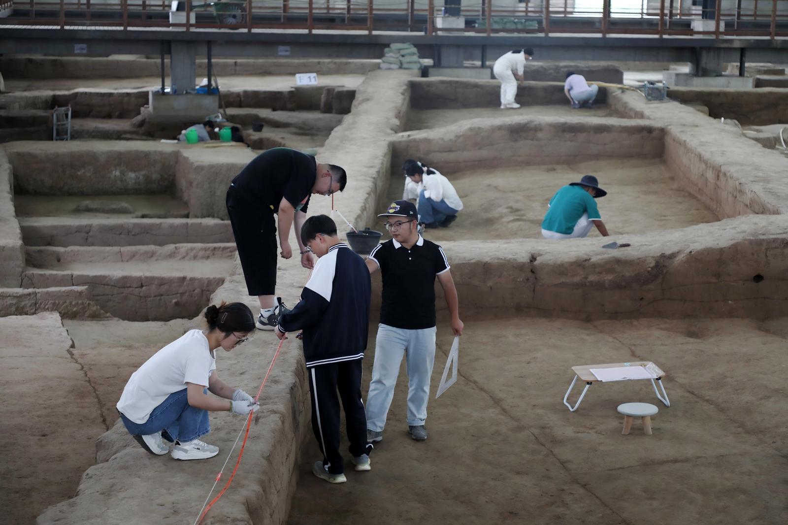 不遠處,另外幾名學(xué)生也在各自負責(zé)的探方內(nèi)忙碌著,畫線、找邊、測量、繪圖,他們用手中的工具,在土層中探尋著慶陽文明脈搏的古老印記。