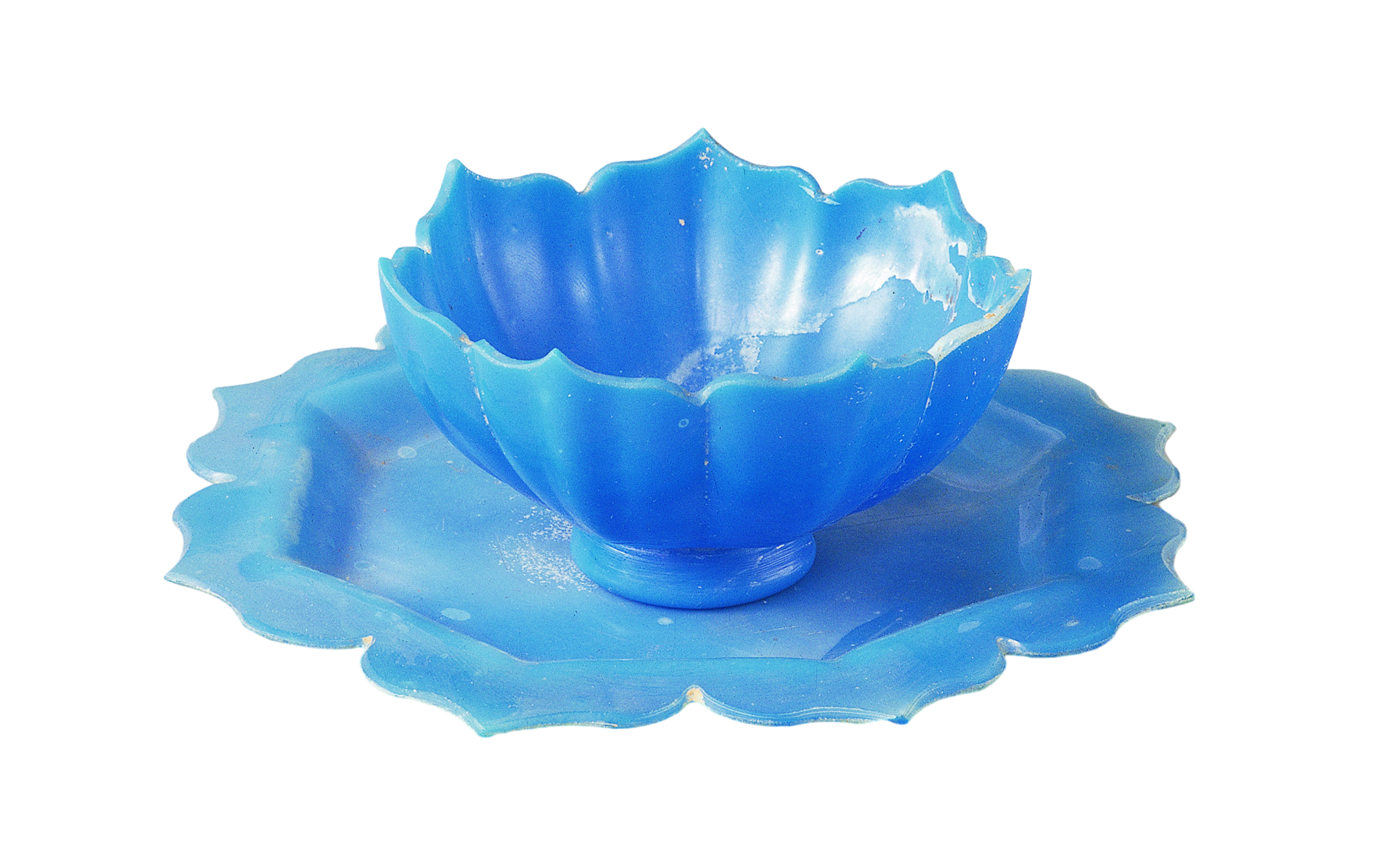 元代 漳縣汪世顯家族墓出土 盞高4.9厘米,口徑8.9厘米,底徑3.4厘米;盞托高1.2厘米,口徑15.2厘米。 玻璃托盞為普藍(lán)色玻璃制成,半透明,胎內(nèi)含氣泡。盞為七瓣蓮花形,餅形足;托口為平口,邊沿呈八瓣蓮花形,平底,腹壁呈正八角形。托盞造型優(yōu)美,色彩艷麗,工藝精湛,是迄今出土最完整的一套元代玻璃托盞。