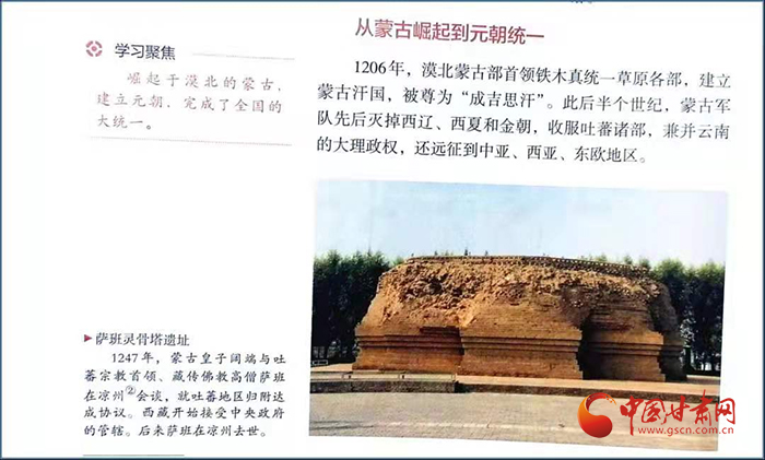 在高一歷史課本第56頁中外歷史綱要(上)第三單元有一段記錄“涼州會(huì)談”的簡(jiǎn)要文字:“1247年,蒙古皇子闊端與吐蕃宗教首領(lǐng)、藏傳佛教高僧薩班在涼州會(huì)談,就吐蕃地區(qū)歸附達(dá)成協(xié)議。西藏開始接受中央政府的管轄。后來薩班在涼州去世。”文字右上角是一張薩班靈骨塔遺址配圖。