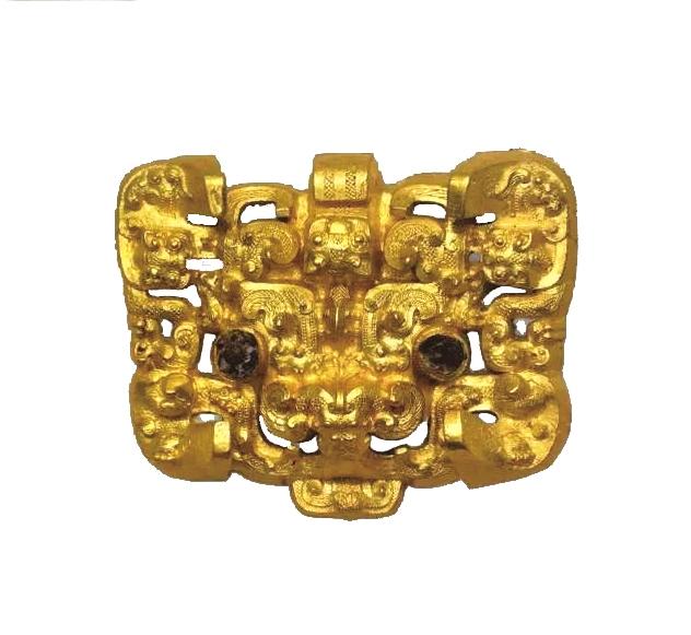 備受關(guān)注的戰(zhàn)國晚期高浮雕獸面紋金帶扣,現(xiàn)藏于甘肅省文物考古研究所。金帶扣的主體為一獸頭,采用高浮雕手法雕出;獸頭上鏤雕出龍獸相斗的圖案,并裝飾有連珠紋、卷云紋、羽狀紋等;獸頭的眼部鑲嵌藍(lán)色玻璃珠。此器物具有中原華夏與邊陲戎狄兩種藝術(shù)風(fēng)格。