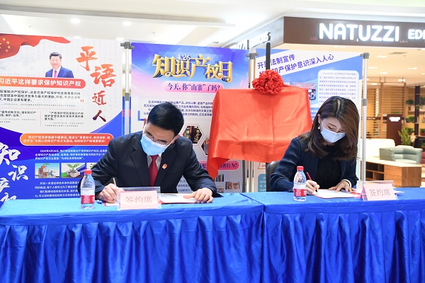 城關(guān)區(qū)法院與居然之家萬佳天水路店,就設(shè)立“知識產(chǎn)權(quán)司法保 護(hù)示范基地”及日常工作的詳細(xì)內(nèi)容簽訂備忘錄。記者 李洋 攝