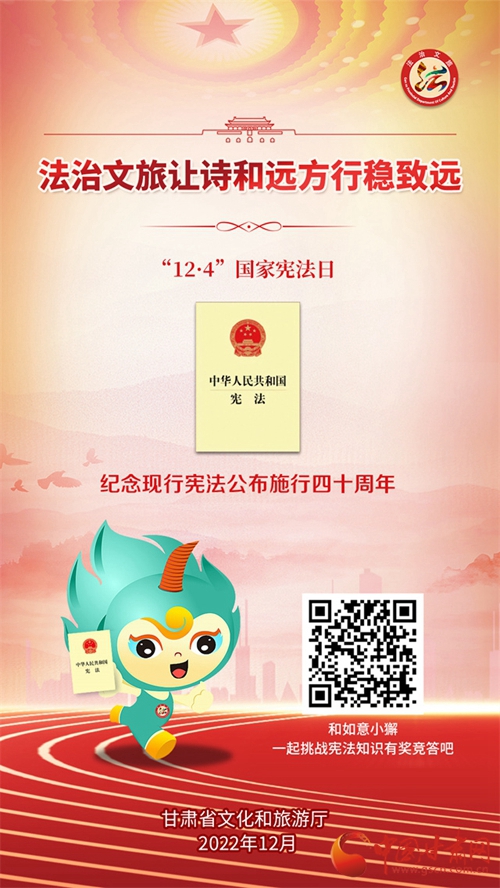 中國甘肅網(wǎng)12月7日訊 (本網(wǎng)記者 張?zhí)m琴)自12月4日國家憲法日暨憲法宣傳周啟動以來,我省各地開展了形式多樣的宣傳活動,為深入學習宣傳貫徹黨的二十大精神,不斷增強人民群眾法治意識,形成全民維護憲法的濃厚氛圍,同時加強文化和旅游的法治宣傳教育,省文旅廳近日開展了國家憲法日暨憲法宣傳周系列活動。
