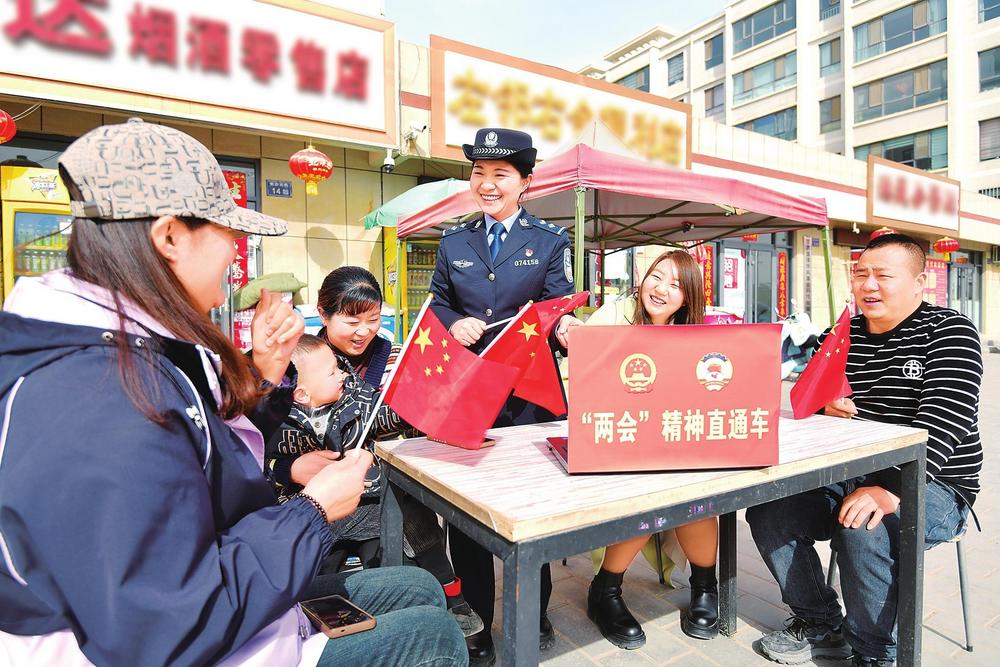 3月12日,臨澤縣公安局工業(yè)開發(fā)區(qū)派出所民警走街入戶,與群眾共同學(xué)習(xí)全國兩會精神。新甘肅·甘肅法治報通訊員安學(xué)海攝