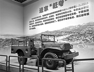 在紀(jì)念館第一部分進(jìn)京“趕考”第二單元展廳內(nèi),一輛軍用吉普車靜靜地陳列于此,這是毛澤東從西柏坡進(jìn)京時乘坐的同款吉普車。該車與普通吉普車相比車身較長,空間寬敞,駕駛員一側(cè)放置有備胎,沒有車門,唯獨副駕駛位置有個豁口;發(fā)動機(jī)蓋為側(cè)開,形制十分特別。