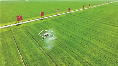 近年來(lái),江蘇省宿遷市宿豫區(qū)多措并舉推動(dòng)耕地保護(hù)責(zé)任落實(shí),加快現(xiàn)代農(nóng)業(yè)產(chǎn)業(yè)園核心區(qū)建設(shè),保障糧食穩(wěn)產(chǎn)增產(chǎn)。圖為近日,在該區(qū)新莊小麥單產(chǎn)提升示范區(qū),無(wú)人機(jī)正在進(jìn)行植保噴灑作業(yè)。朱冠軍 攝