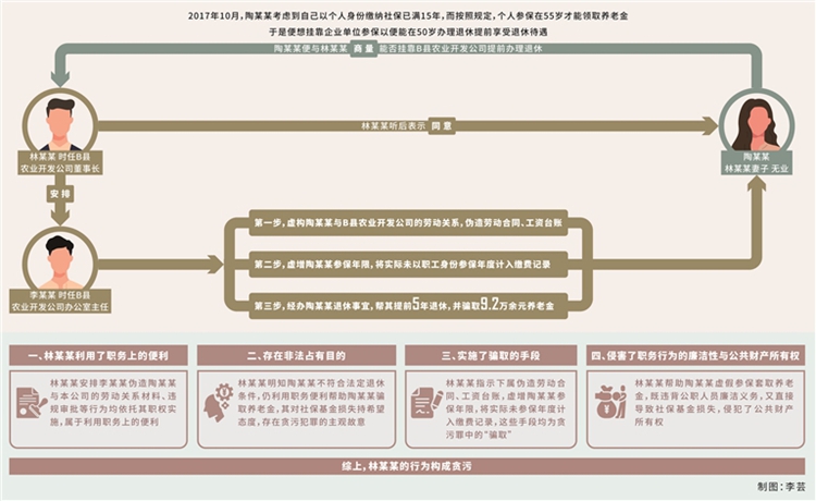 貪污罪。2017年10月,林某某妻子陶某某(無(wú)業(yè),另案處理)考慮到自己以個(gè)人身份繳納社保已滿15年,而按照規(guī)定,個(gè)人參保在55歲才能領(lǐng)取養(yǎng)老金,于是便想掛靠企業(yè)單位參保,以便能在50歲辦理退休、提前享受退休待遇。基于此,陶某某便與林某某商量能否掛靠B縣農(nóng)業(yè)開發(fā)公司提前辦理退休,林某某聽后表示同意,并利用擔(dān)任該公司董事長(zhǎng)的職務(wù)便利,在明知陶某某不符合提前退休條件的情況下,安排時(shí)任公司辦公室主任李某某(另案處理)虛構(gòu)勞動(dòng)關(guān)系,為陶某某以該公司職工身份辦理退休事宜。手續(xù)辦理過程中,李某某按林某某的安排,偽造B縣農(nóng)業(yè)開發(fā)公司與陶某某的《勞動(dòng)合同書》,經(jīng)林某某本人簽字后加蓋公司合同專用章,陶某某憑該合同在B縣人力資源和社會(huì)保障局進(jìn)行勞動(dòng)合同鑒證。完成鑒證后,陶某某順利以B縣農(nóng)業(yè)開發(fā)公司職工身份參保,當(dāng)年度公司為其繳納職工養(yǎng)老保險(xiǎn)、工傷保險(xiǎn)、失業(yè)保險(xiǎn)、醫(yī)療保險(xiǎn)共計(jì)7649.76元。其間,陶某某從未在B縣農(nóng)業(yè)開發(fā)公司上班,也未向公司補(bǔ)繳為其繳納的社保費(fèi)用。