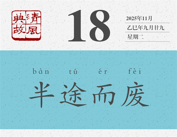 “半途而廢”語(yǔ)出《中庸》:“君子遵道而行,半途而廢,吾弗能已矣。”這句話是孔子說的:“君子遵循正道而行,但往往半途而廢,我絕不會(huì)停止的。”