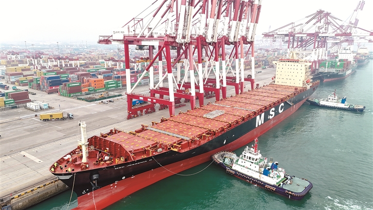 1月4日,澳洲直航新航線首班船舶靠泊山東港口青島港,標(biāo)志著該港2026年首條外貿(mào)新航線正式開通。圖為澳洲直航新航線首班船舶——“地中海杰西尼亞”輪靠泊山東港口青島港。新華社發(fā)(張進剛 攝)