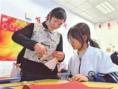 張掖市山丹縣非遺傳承人在山丹培黎學校教同學剪紙。聶英 攝