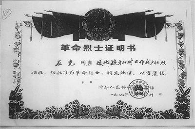 1989年中華人民共和國民政部頒發(fā)的左克革命烈士證明書。