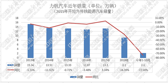2006年,力帆推出首款轎車力帆520,新車不足5萬(wàn)元的售價(jià)在當(dāng)時(shí)引發(fā)關(guān)注,月銷量一度達(dá)到5000輛。2013年,力帆年銷售汽車15.34萬(wàn)輛,成為汽車界的一匹黑馬。然而,好景不長(zhǎng)。自2016年開始,力帆汽車進(jìn)入下行趨勢(shì),目前更是步履維艱。力帆產(chǎn)銷快報(bào)顯示,2019年1-10月,力帆傳統(tǒng)乘用車?yán)塾?jì)銷售2.2萬(wàn)輛,同比下滑73.5%,10月僅銷售29輛;新能源累計(jì)銷售2458輛,同比下降65.42%,10月僅銷售423輛。