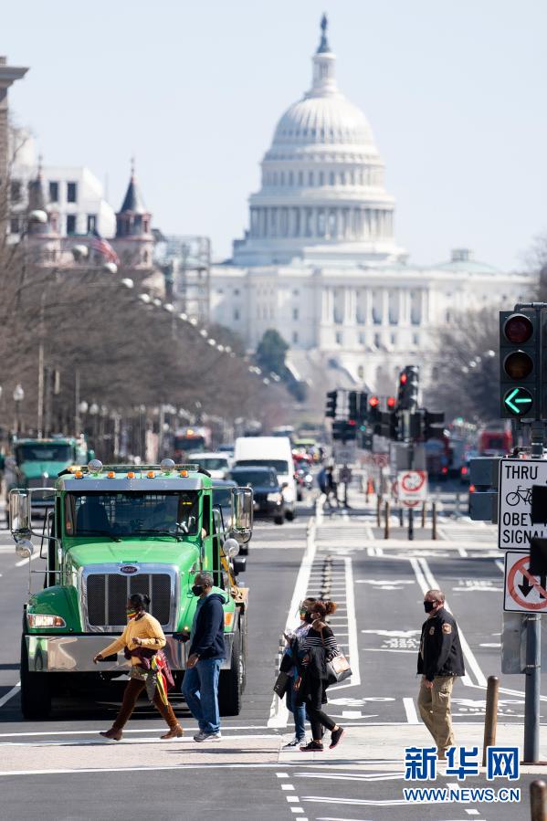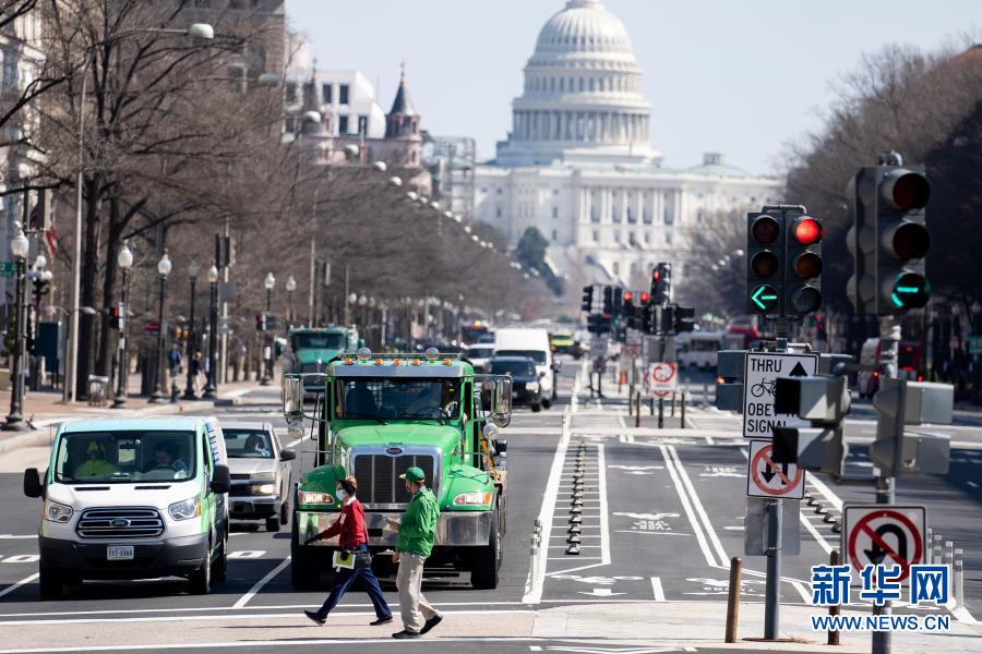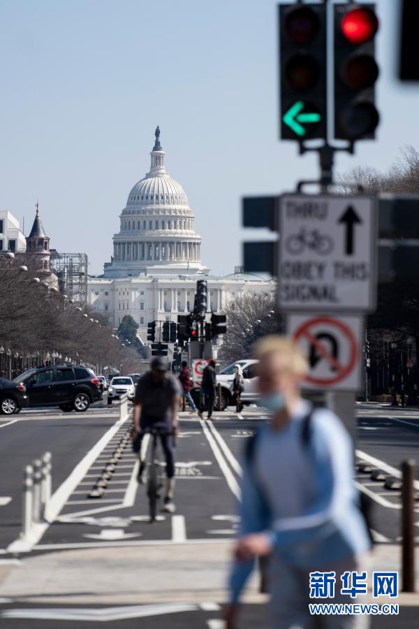 3月10日,在美國首都華盛頓,人們經(jīng)過國會(huì)大廈附近的一處路口。新華社記者劉杰攝