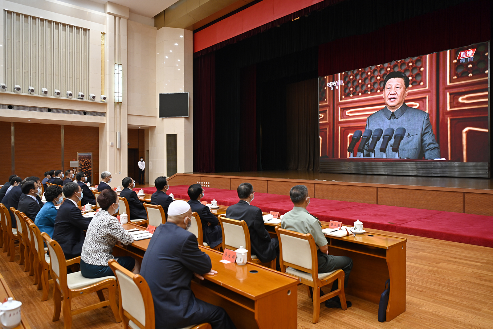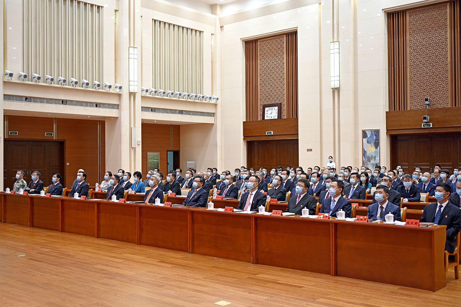 7時(shí)53分許,在歡快的樂(lè)曲聲中,習(xí)近平等黨和國(guó)家領(lǐng)導(dǎo)人來(lái)到天安門(mén)城樓主席臺(tái),會(huì)場(chǎng)爆發(fā)出熱烈的掌聲。8時(shí)整,慶祝大會(huì)開(kāi)始,中國(guó)人民解放軍聯(lián)合軍樂(lè)團(tuán)奏響雄壯的《義勇軍進(jìn)行曲》,尹弘、任振鶴等全體起立,隨北京現(xiàn)場(chǎng)一起高唱中華人民共和國(guó)國(guó)歌,目視大屏幕里鮮艷奪目的五星紅旗冉冉升起,在天安門(mén)廣場(chǎng)上空迎風(fēng)飄揚(yáng)。在熱烈的掌聲中,習(xí)近平總書(shū)記發(fā)表重要講話(huà),大家認(rèn)真聆聽(tīng)、專(zhuān)心筆記,第一時(shí)間深刻學(xué)習(xí)領(lǐng)會(huì),不時(shí)報(bào)以熱烈的掌聲。